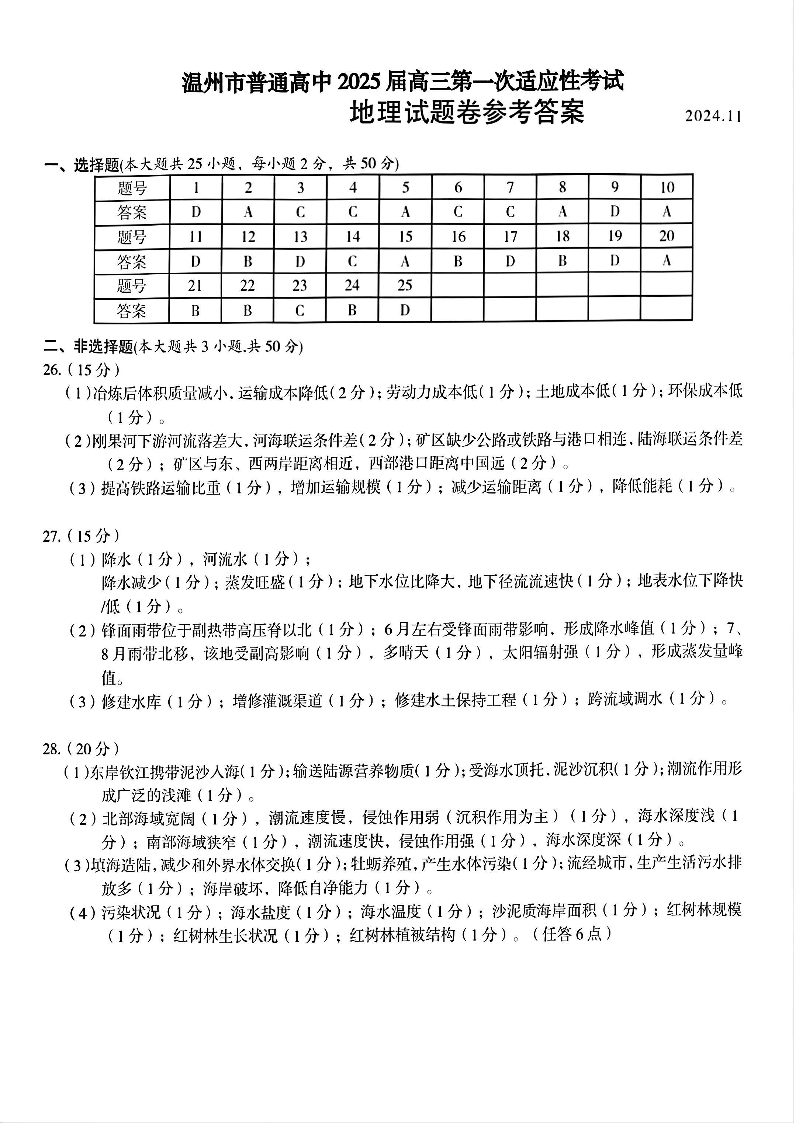 浙江省温州市普通高中2025届高三第一次适应性考试 地理答案