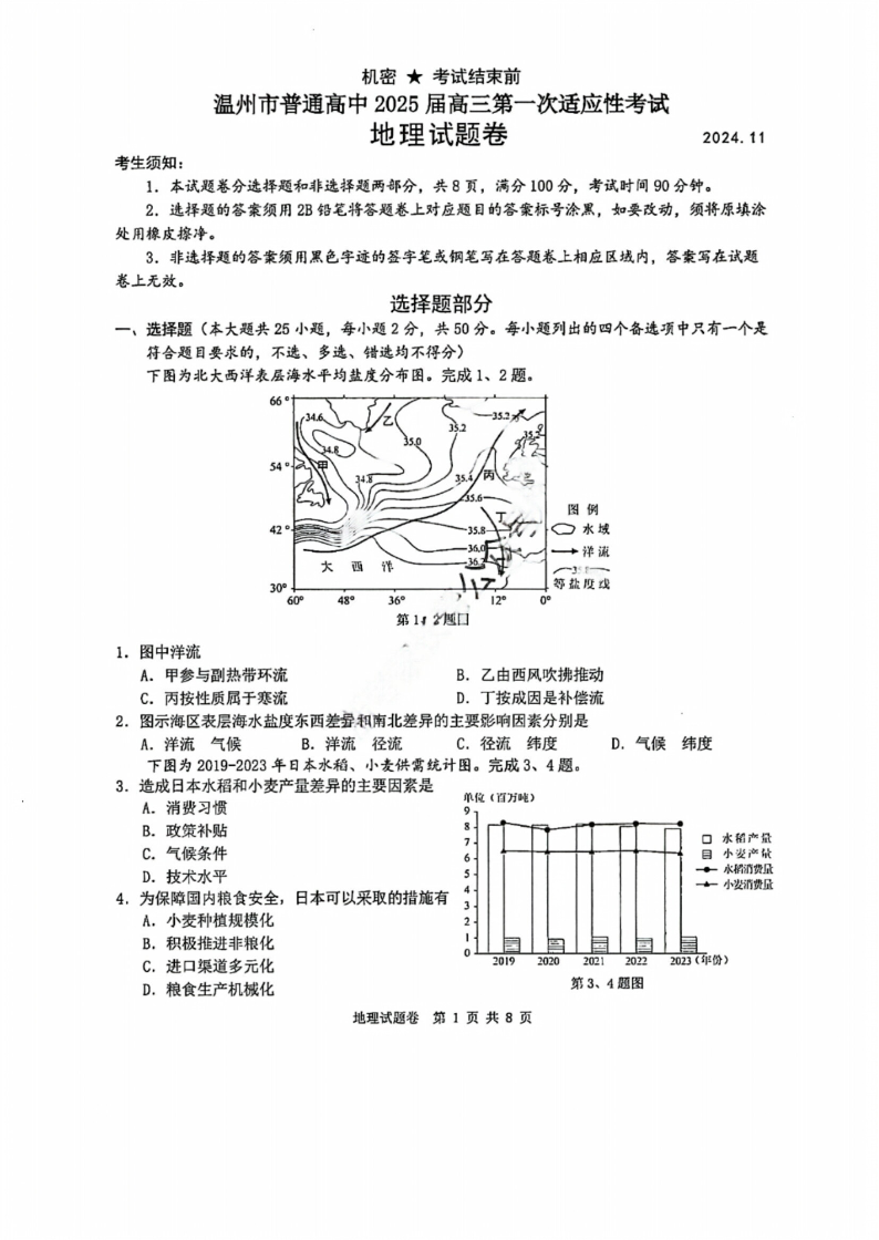 浙江省温州市普通高中2025届高三第一次适应性考试 地理