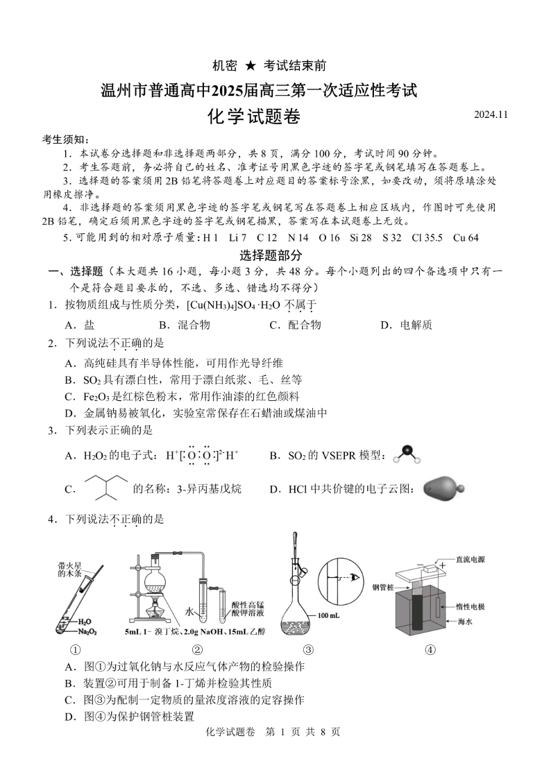 浙江省温州市普通高中2025届高三第一次适应性考试 化学