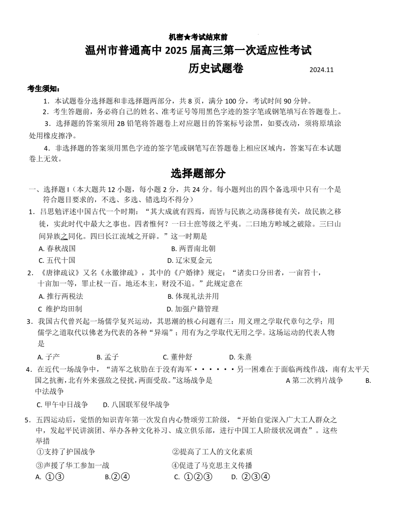 浙江省温州市普通高中2025届高三第一次适应性考试 历史