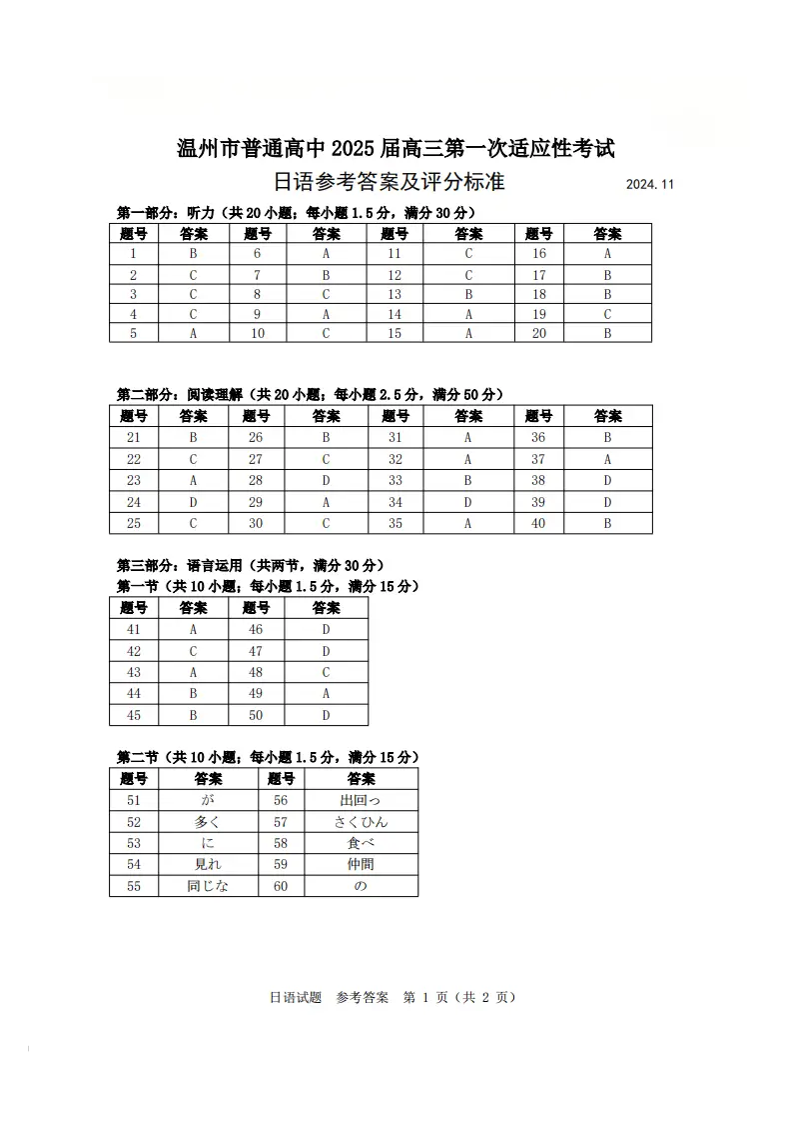 浙江省温州市普通高中2025届高三第一次适应性考试 日语答案