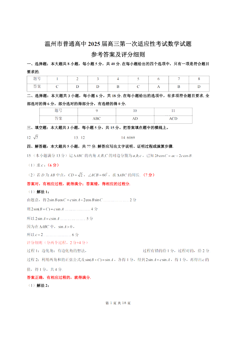 浙江省温州市普通高中2025届高三第一次适应性考试 数学答案