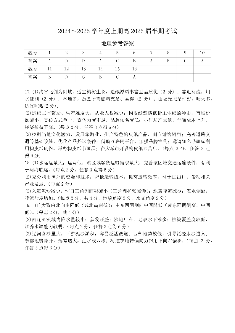 四川省成都市第七中学202~2025学年度上期高2025届半期考试 地理答案