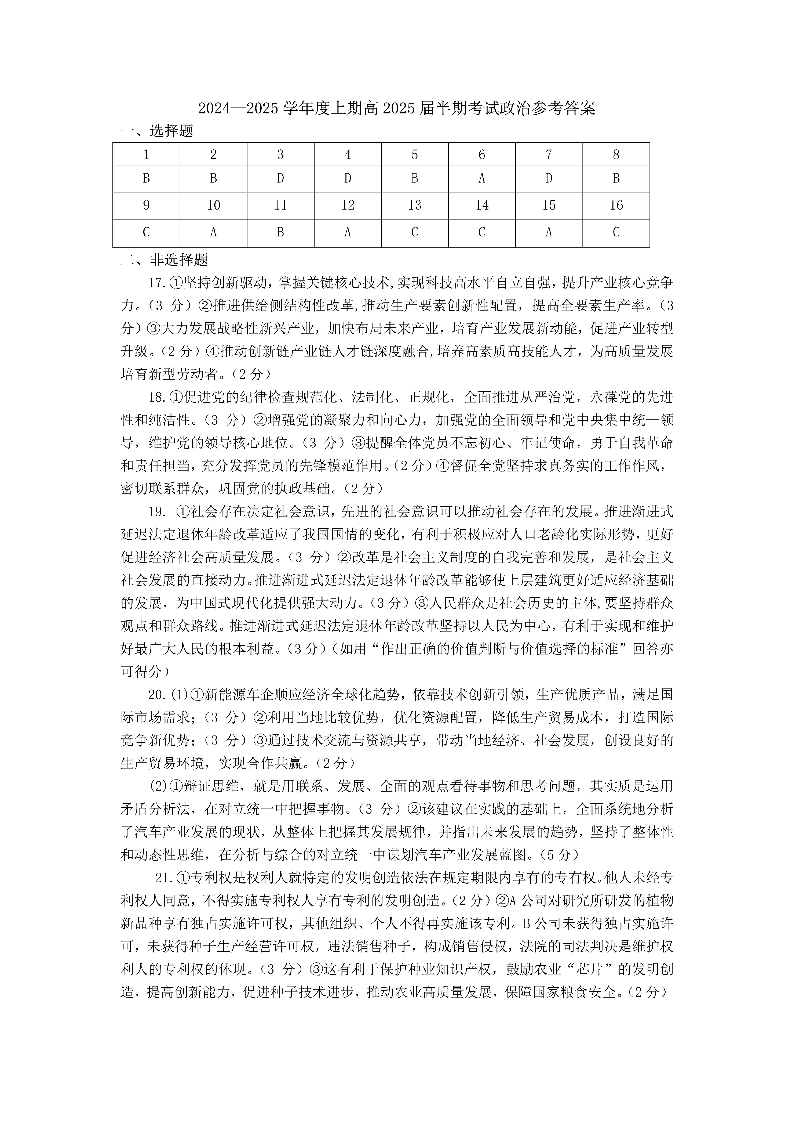 四川省成都市第七中学202~2025学年度上期高2025届半期考试 政治答案