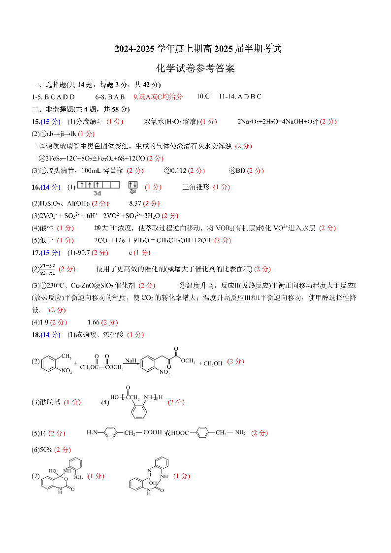 四川省成都市第七中学202~2025学年度上期高2025届半期考试 化学答案
