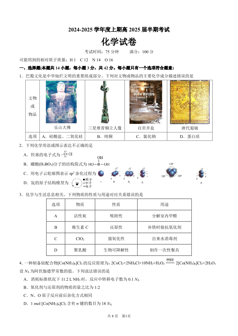 四川省成都市第七中学202~2025学年度上期高2025届半期考试 化学