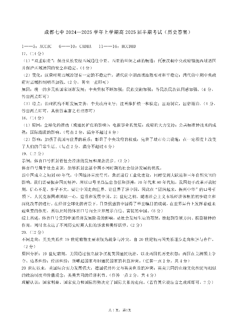 四川省成都市第七中学202~2025学年度上期高2025届半期考试 历史答案