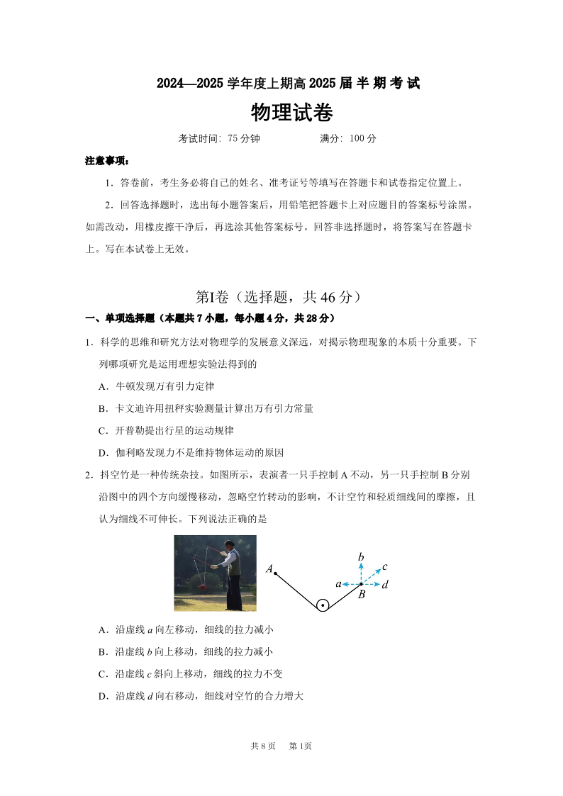 四川省成都市第七中学202~2025学年度上期高2025届半期考试 物理
