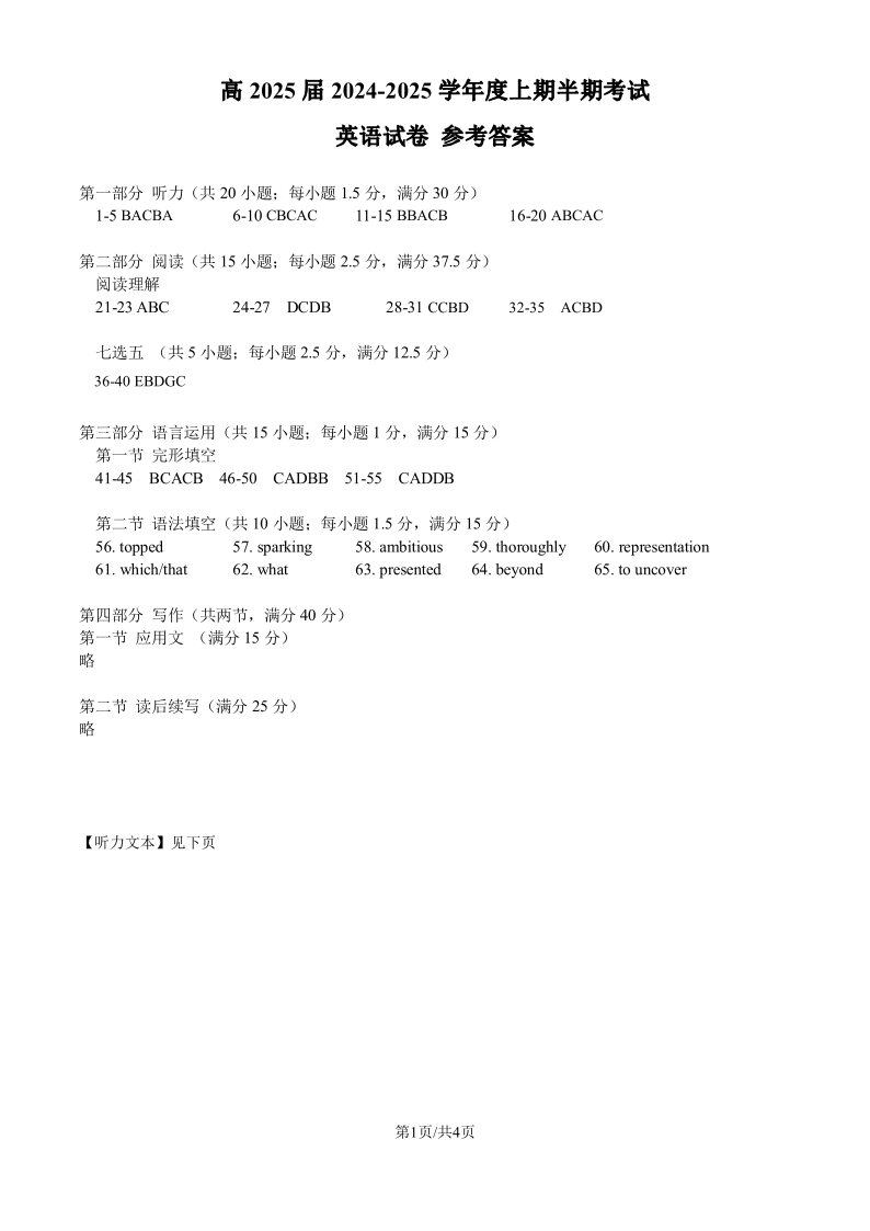 四川省成都市第七中学202~2025学年度上期高2025届半期考试 英语答案