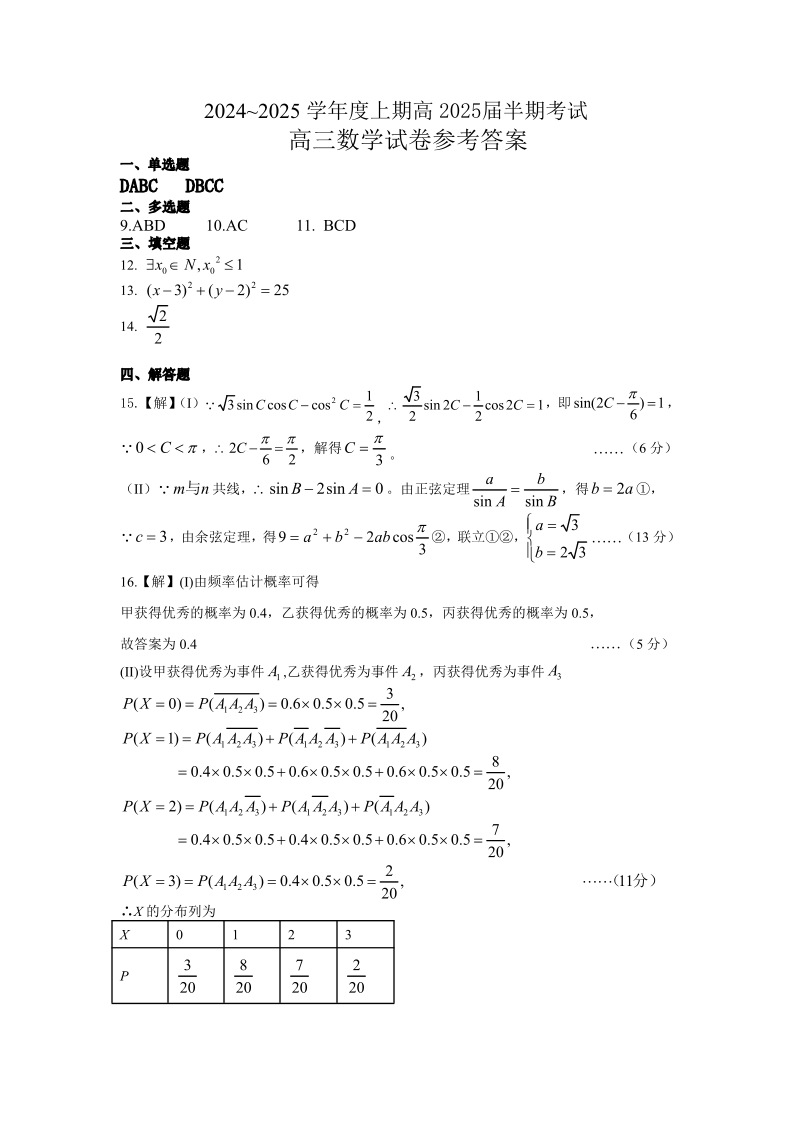 四川省成都市第七中学202~2025学年度上期高2025届半期考试 数学答案