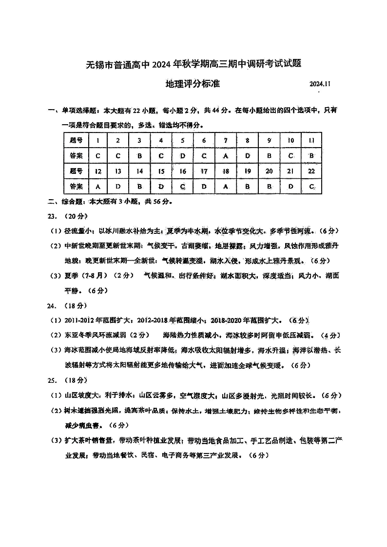 江苏省无锡市2025届高三11月期中教学质量调研测试 地理答案