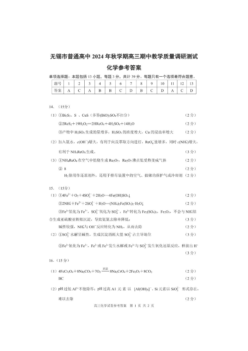 江苏省无锡市2025届高三11月期中教学质量调研测试 化学答案