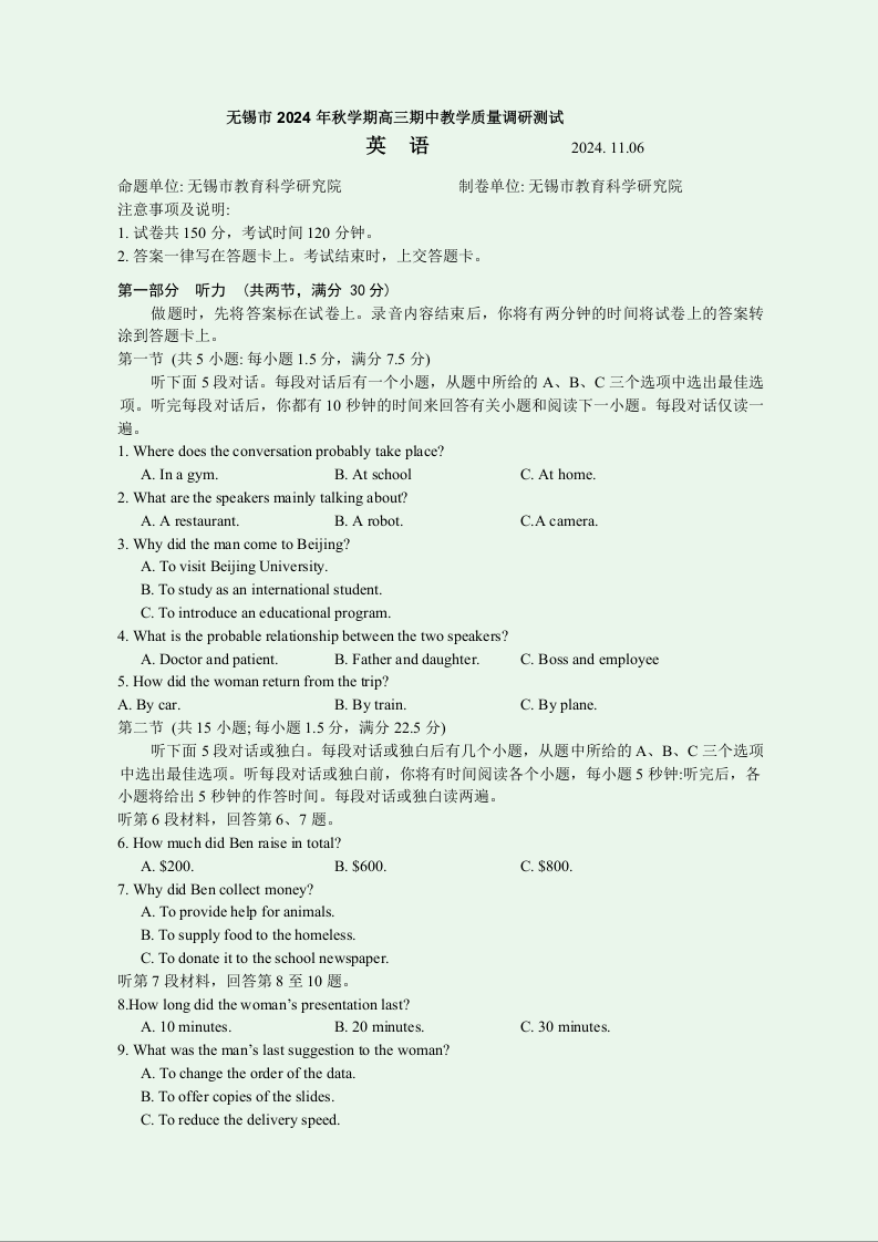 江苏省无锡市2025届高三11月期中教学质量调研测试 英语