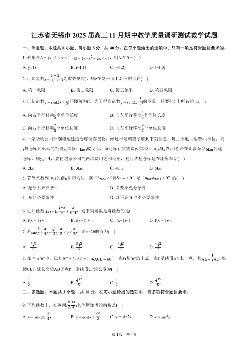 江苏省无锡市2025届高三11月期中教学质量调研测试 数学