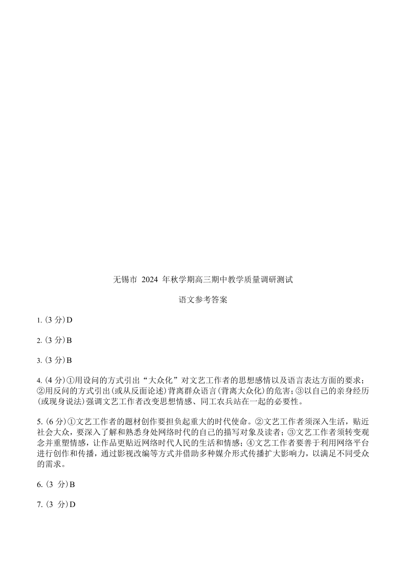 江苏省无锡市2025届高三11月期中教学质量调研测试 语文答案