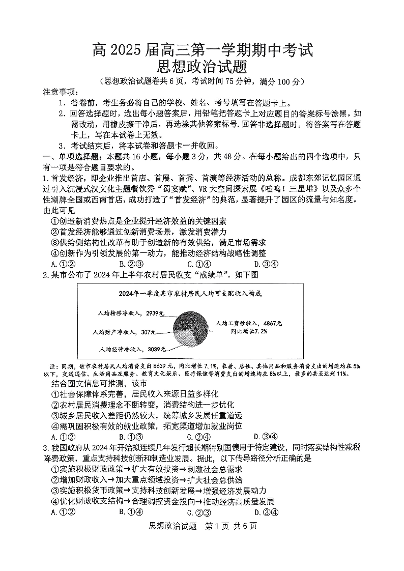 重庆九龙坡主城五区2025届高三期中考试 政治