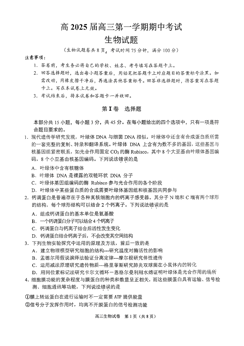 重庆九龙坡主城五区2025届高三期中考试 生物