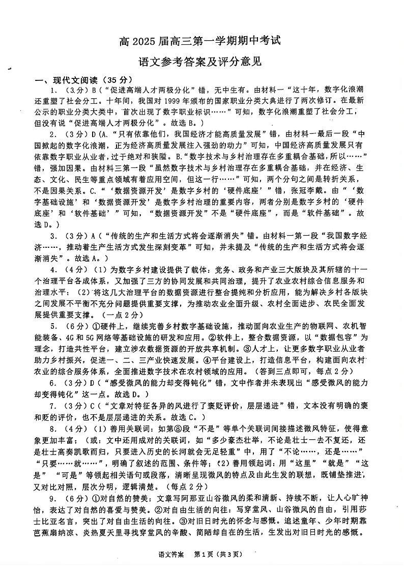 重庆九龙坡主城五区2025届高三期中考试 语文答案
