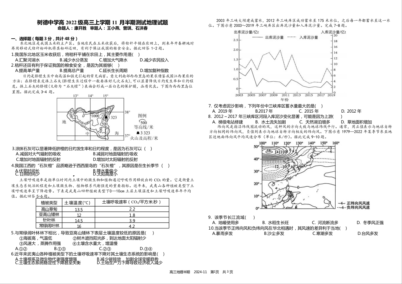 四川省成都市树德中学高2025届高三上学期期中测试 地理