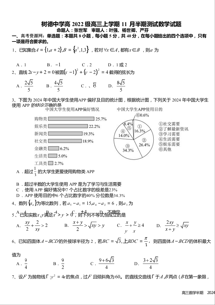 四川省成都市树德中学高2025届高三上学期期中测试 数学