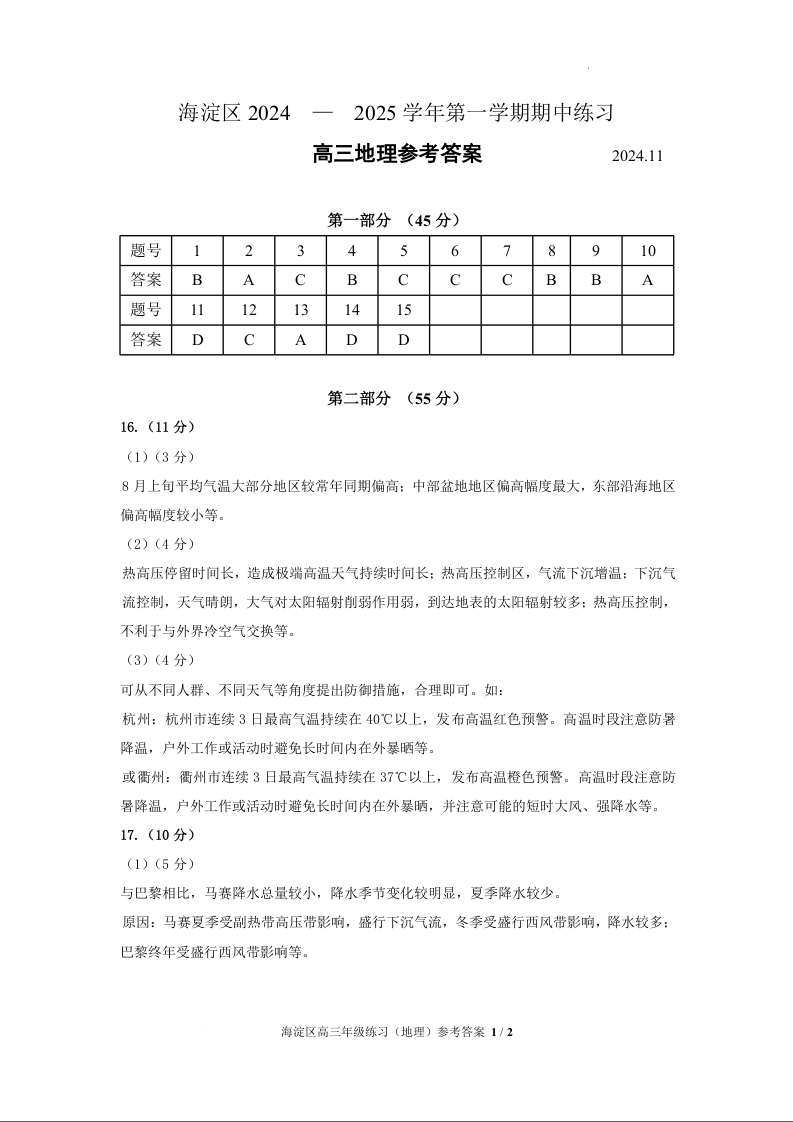 北京市海淀区2025届高三上学期期中考试 地理答案