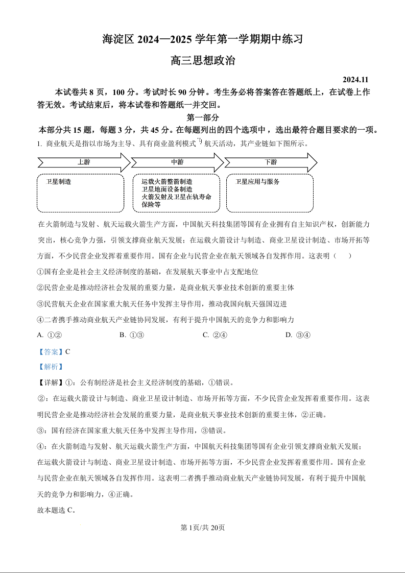 北京市海淀区2025届高三上学期期中考试 政治答案