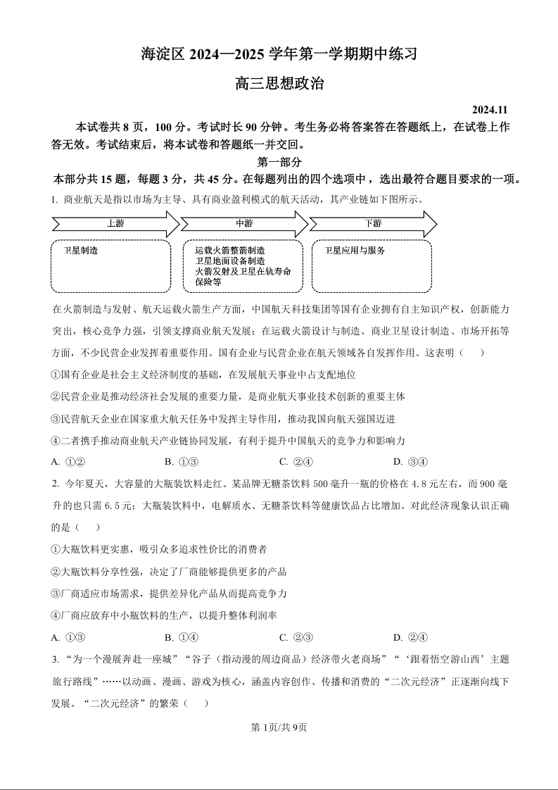 北京市海淀区2025届高三上学期期中考试 政治