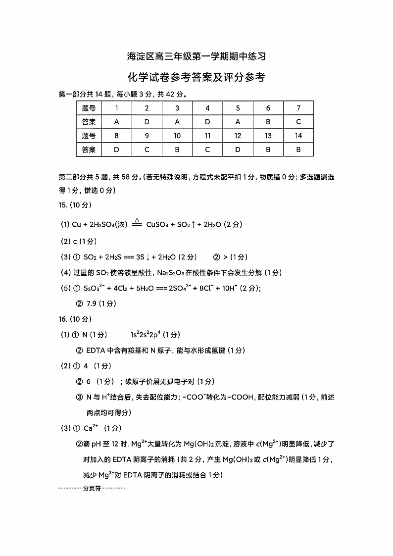 北京市海淀区2025届高三上学期期中考试 化学答案