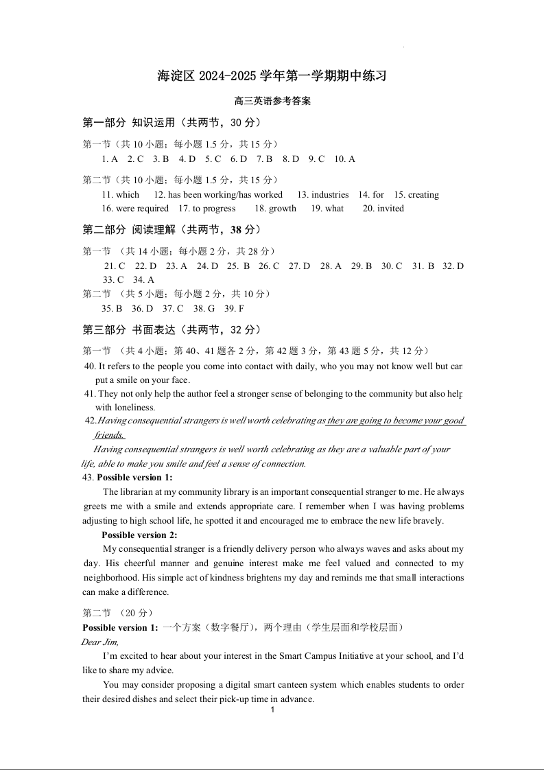 北京市海淀区2025届高三上学期期中考试 英语答案