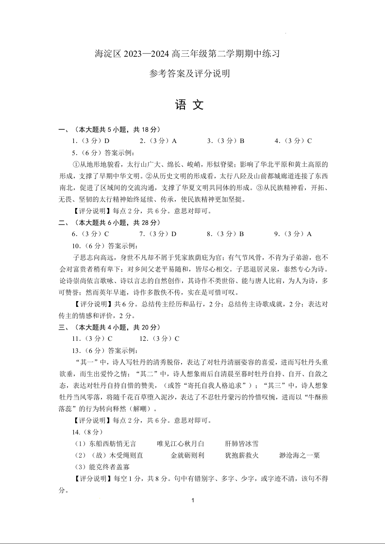 北京市海淀区2025届高三上学期期中考试 语文答案
