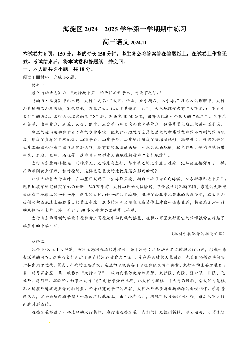 北京市海淀区2025届高三上学期期中考试 语文