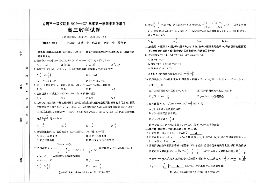 福建省龙岩市一级校联盟2025届高三上学期11月期中考试 数学