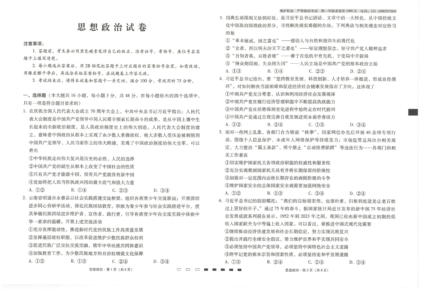 云南师范大学附属中学2024-2025学年高考适应性月考卷(五)政治