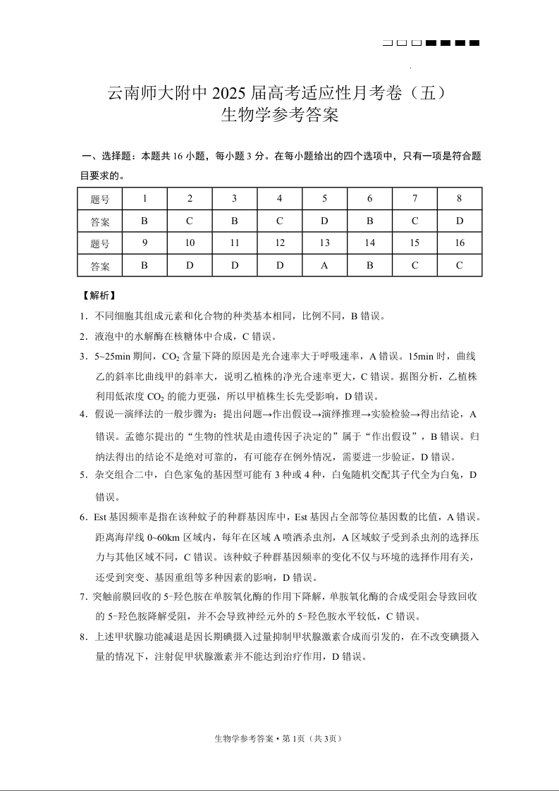 云南师范大学附属中学2024-2025学年高考适应性月考卷(五)生物答案