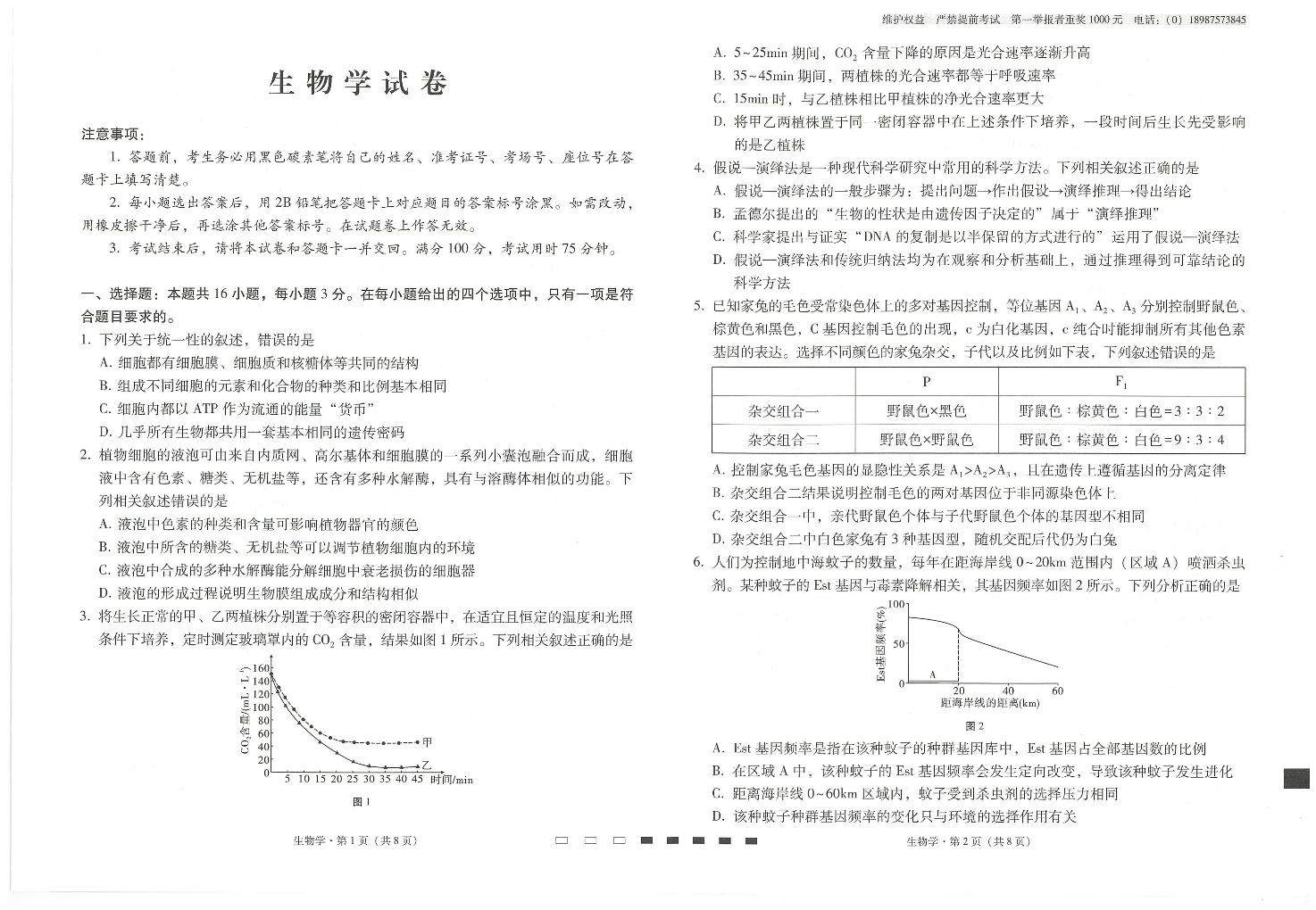 云南师范大学附属中学2024-2025学年高考适应性月考卷(五)生物