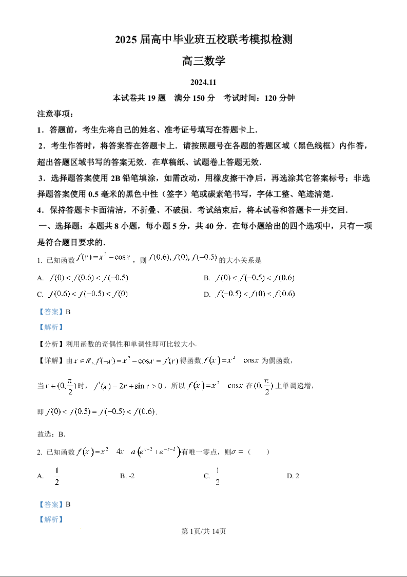 泉州市2025届高三毕业班五校联考 数学答案