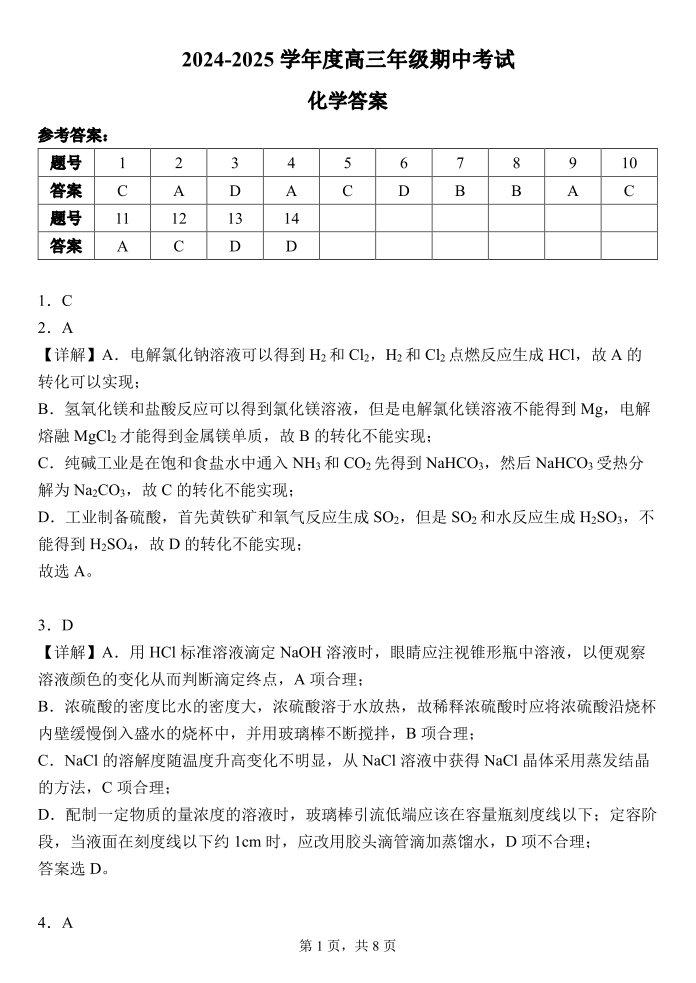 河南省郑州中学2025届高三上学期11月期中考试 化学答案