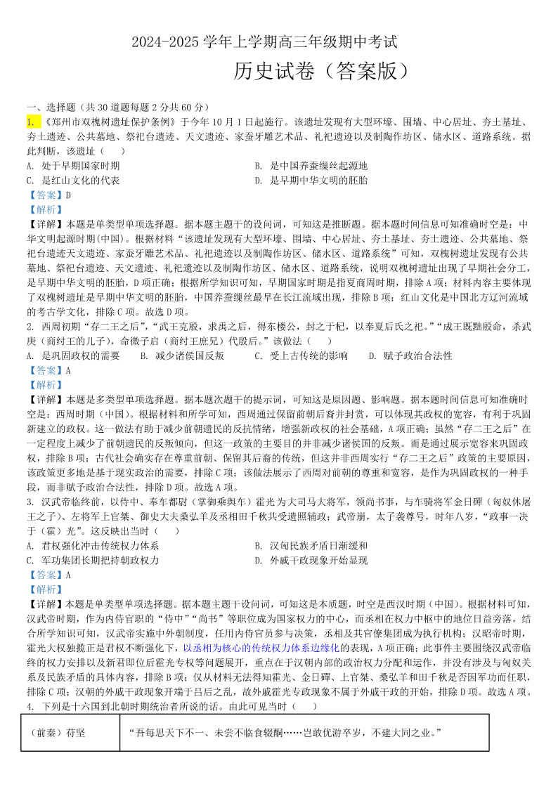 河南省郑州中学2025届高三上学期11月期中考试 历史答案
