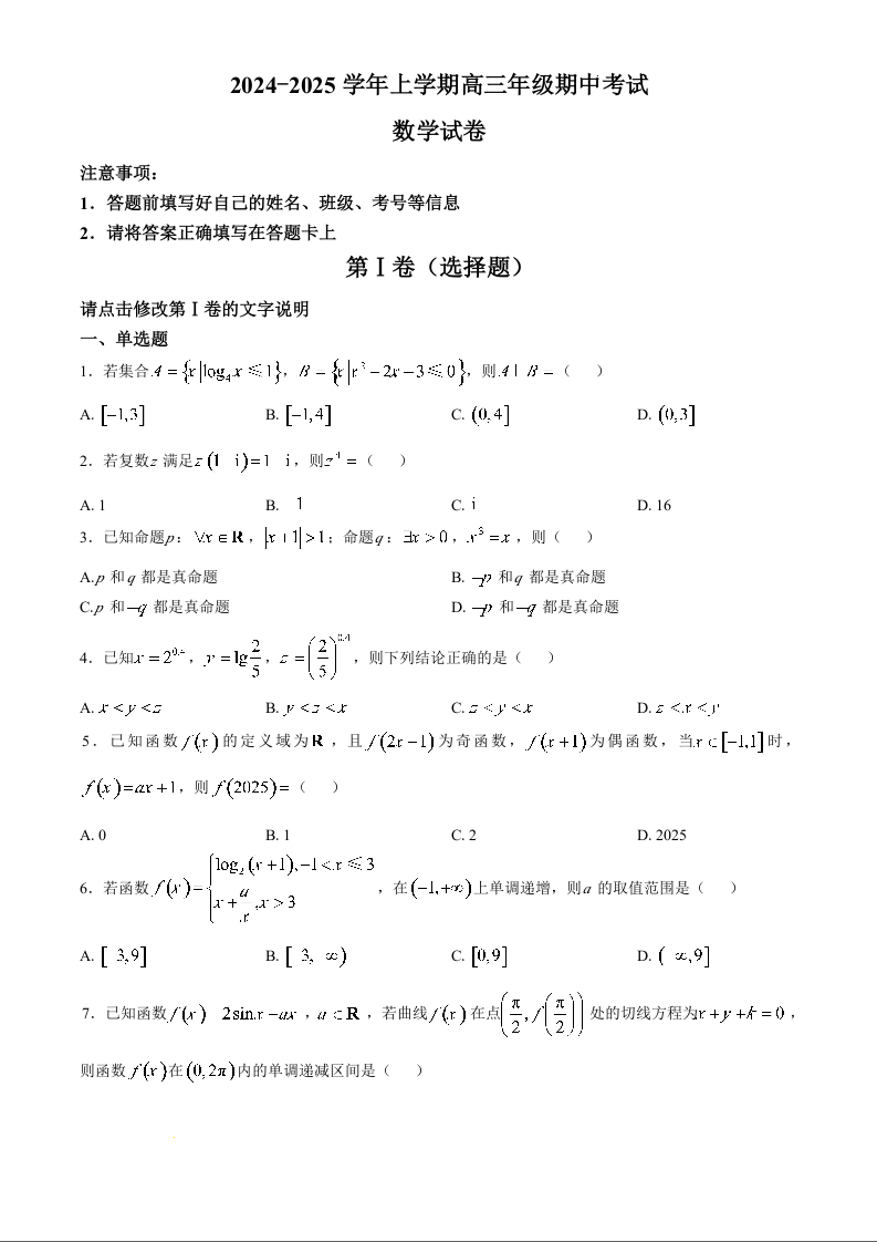 河南省郑州中学2025届高三上学期11月期中考试 数学