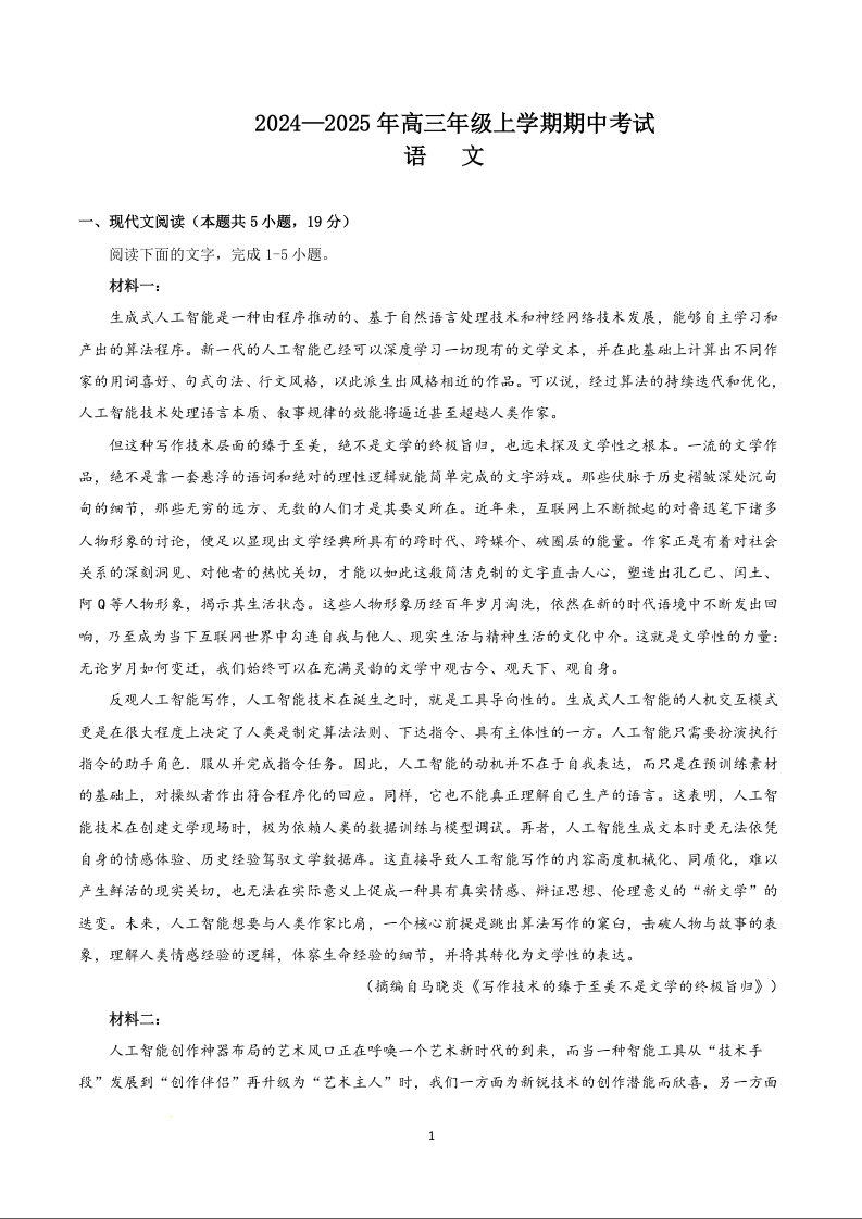 河南省郑州中学2025届高三上学期11月期中考试 语文