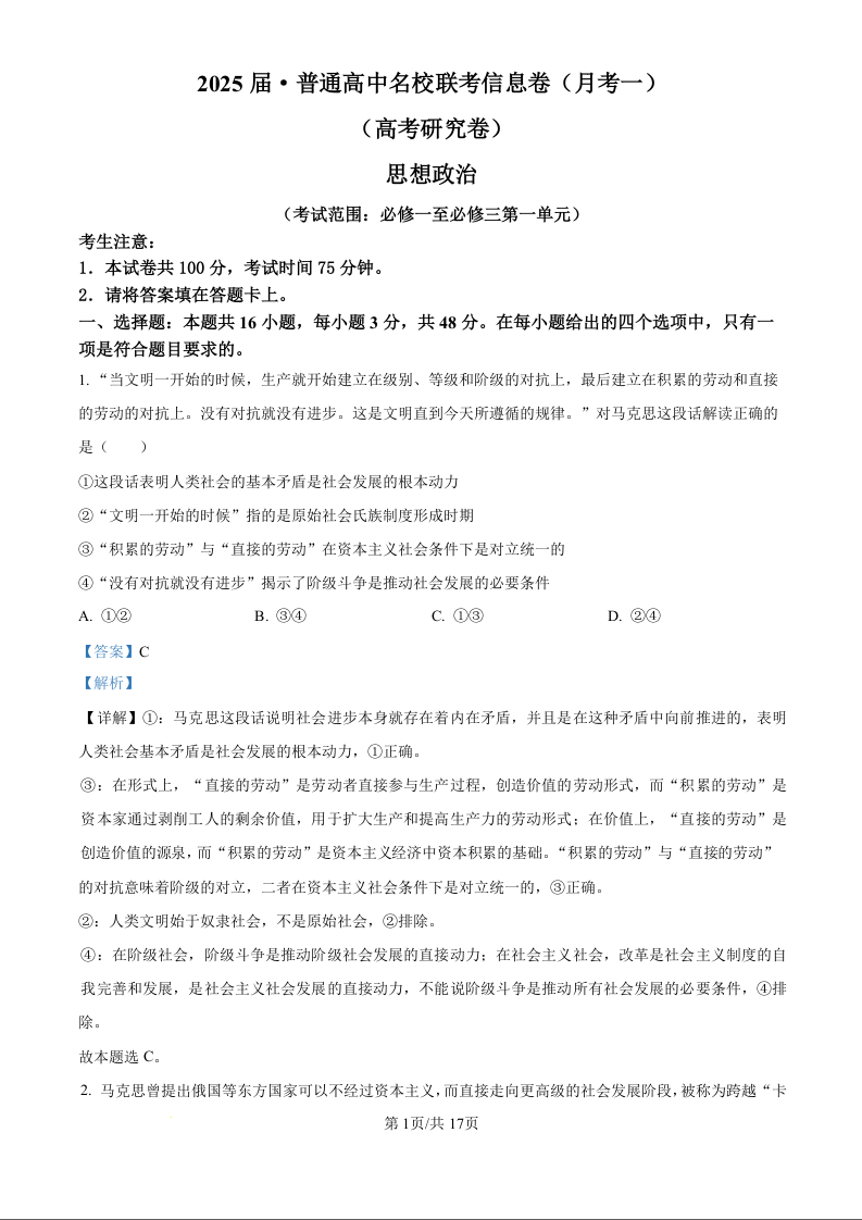 湖南省娄底市名校联考2025届高三上学期11月月考 政治答案