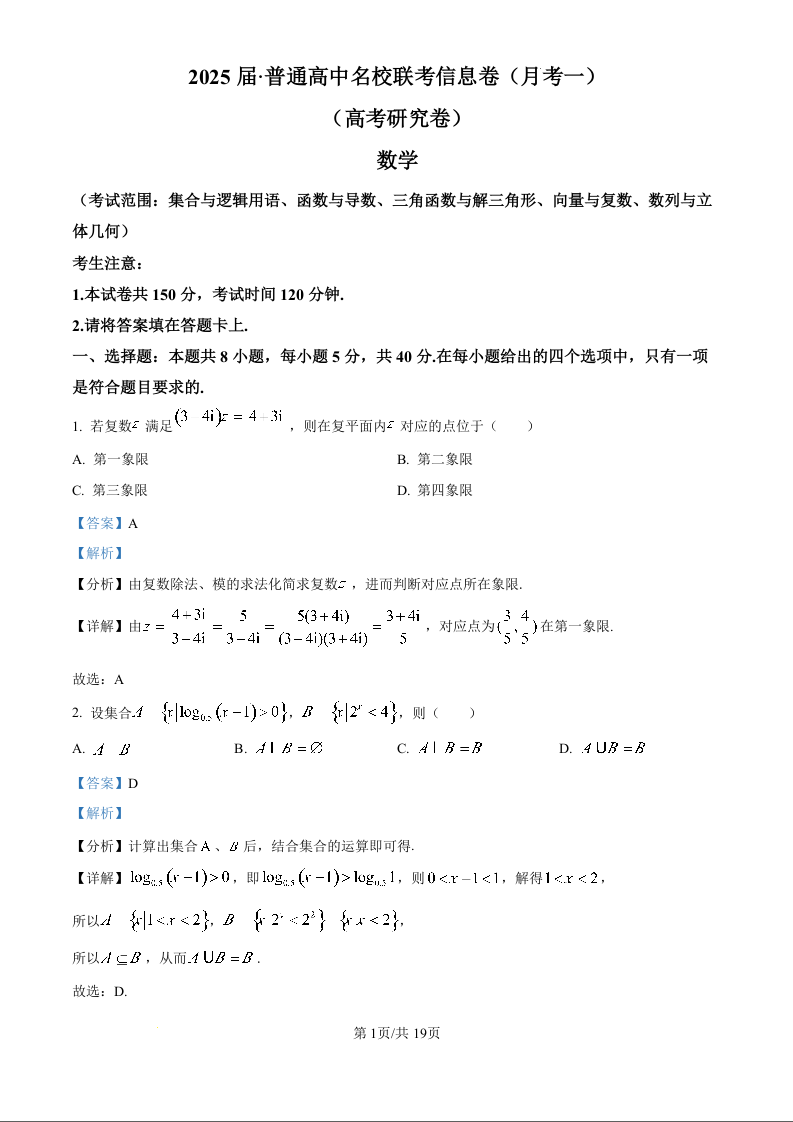 湖南省娄底市名校联考2025届高三上学期11月月考 数学答案