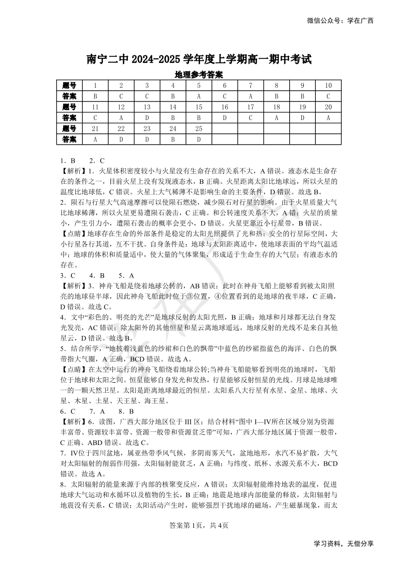 南宁二中2024年秋季期中高一 地理答案