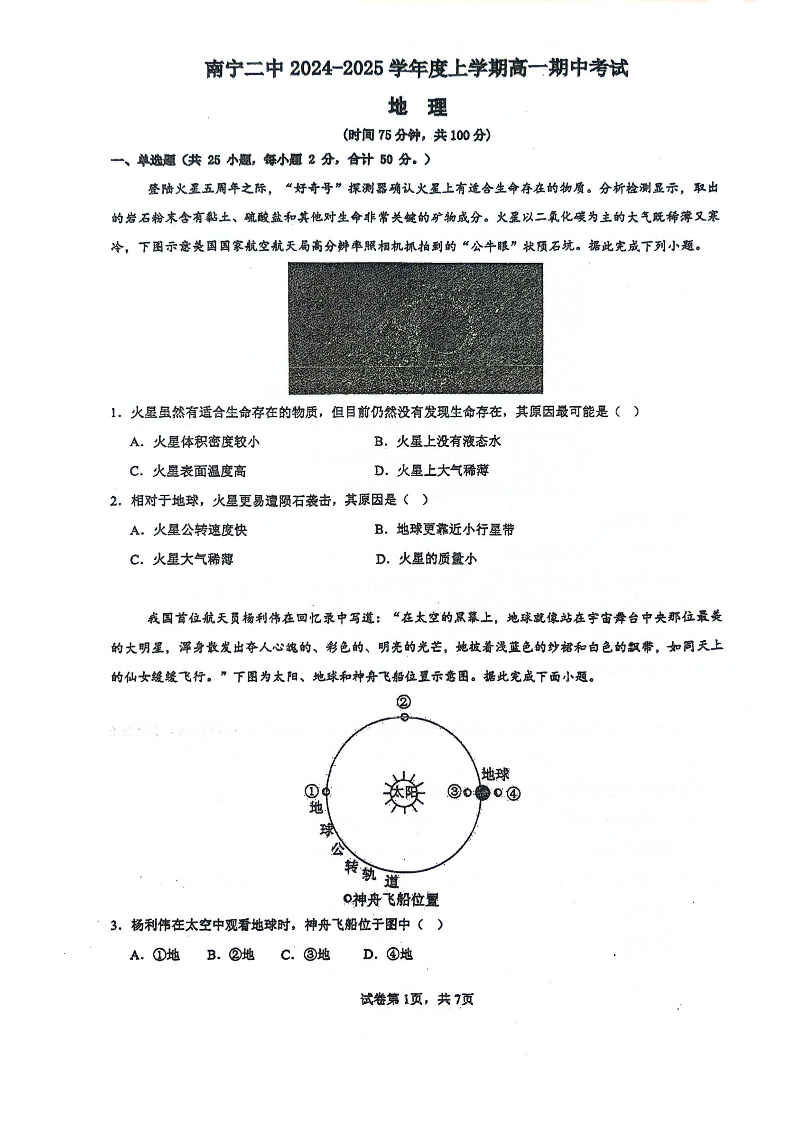 南宁二中2024年秋季期中高一 地理