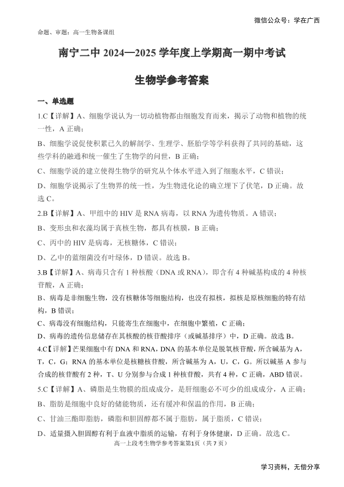 南宁二中2024年秋季期中高一 生物答案