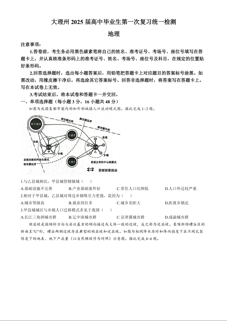 云南省大理州2025届高中毕业生第一次复习统一检测 地理