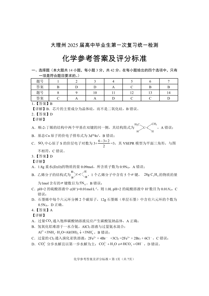 云南省大理州2025届高中毕业生第一次复习统一检测 化学答案