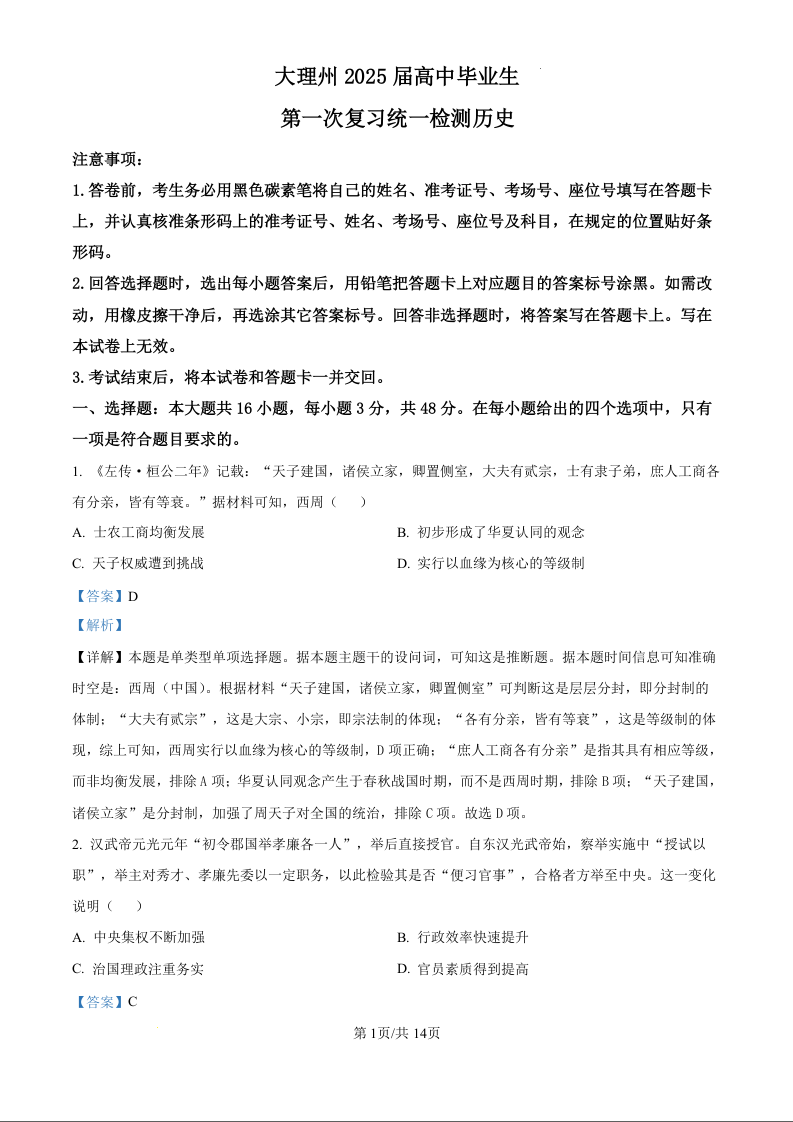 云南省大理州2025届高中毕业生第一次复习统一检测 历史答案