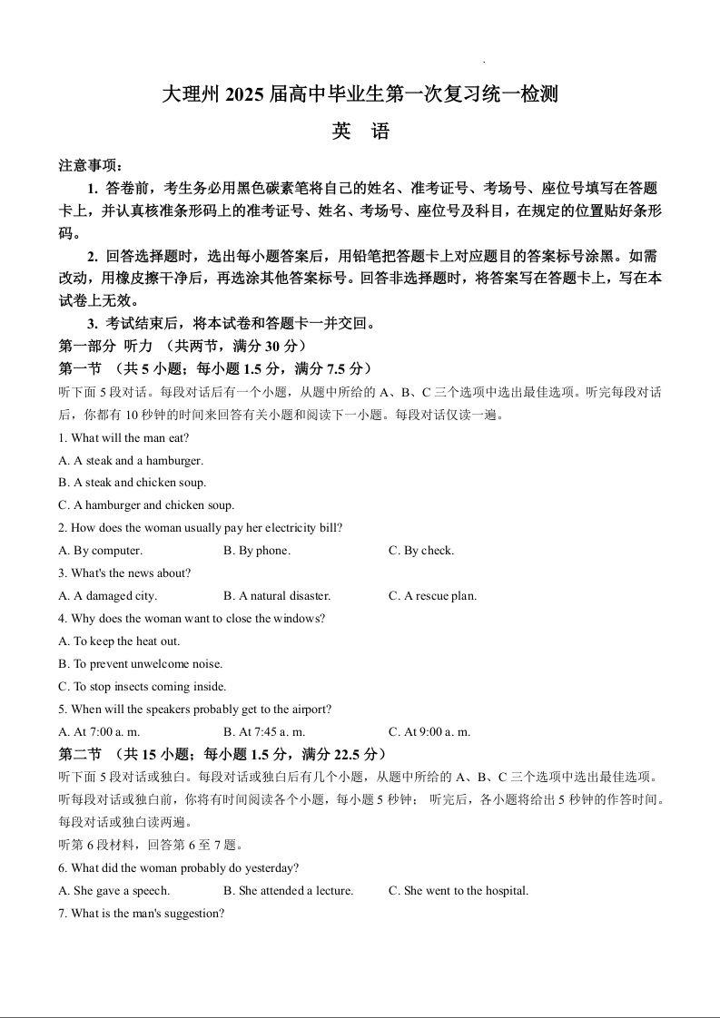 云南省大理州2025届高中毕业生第一次复习统一检测 英语