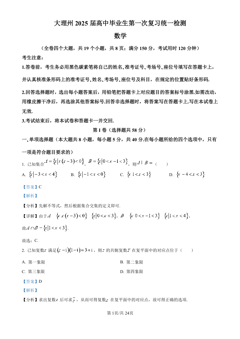 云南省大理州2025届高中毕业生第一次复习统一检测 数学答案
